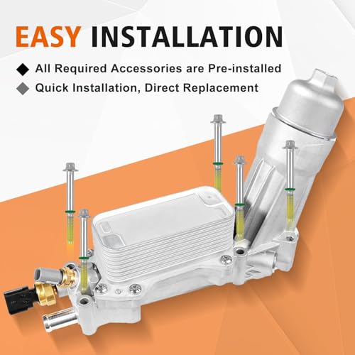 🆗【Easy To Install & Direct Replacement】This is a Full Pre-installed oil Filter Assembly, including: 1 x Aluminum Engine Oil Cooler , 1 x Oil Filter housing , 1x Aluminum Oil Filter Cap, 1 x Oil Filter, 1 x Pressure Sensor, 1 x Temperature Sensor, 5 x O-rings and manifold Seals, 11 x Engine Mounting Bolts, 12 x Gaskets