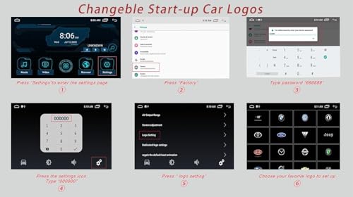 【 Logo Setting】 The boot logo is diversify, not only can you set the car logo, you can also set pictures, family and pets.* Logo Set-up Steps* ①Press “Settings” to enter the settings page.②Press “Factory”. ③Type password “666888”. ④Press the settings icon and Type“000000”. ⑥Choose your favourite logo to set up.