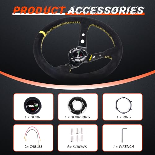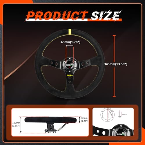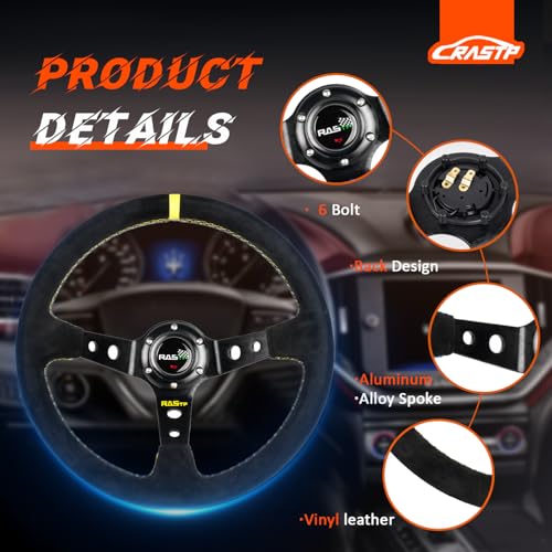 RASTP Universal Racing Steering Wheel Suede Deep Dish 13.58”/345mm 6 Bolts with Horn Button Include Cable,Wrench (Yellow)