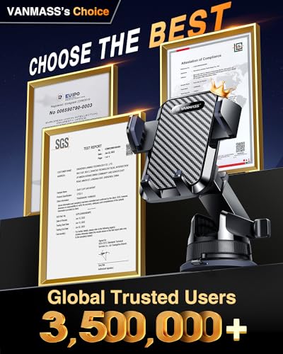 【BEST Newest Car Phone Holder】VANMASS’s best car phone mount with the highest rating! Preferred by 3,500,000+ Customers; Designed by world-class professional team; enjoy EUIPO Patent (No.007708805-0001), Military-grade certificate (No. GZMR220601855501), CP65/REACH/ROHS; 4,000+ kinds of material selection, 500+ suction cup upgrade designs, and 20,000 miles of road tests; giving birth to the best combo of the Flagship&Classic hoolder with newest suction cup