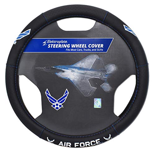Officially licensed – U.S. Air Force steering wheel cover by Elektroplate. Faux leather provides comfort, durability, and premium stitching gives it an elevated level of style. Our premium steering wheel covers feature full color designs and custom graphics. The cover is easy to install and will protect your steering wheel from scratches, wear out and sun damage. The medium size is suitable for mid-size SUVs and trucks with a steering wheel diameter of 14.7”-15.4”. We offer multiple sizes to ensure a perfect fit – the small size fits steering wheels 13.9” to 14.6” and the large size fits steering wheels 15.5” to 16.2” in diameter. Our high-end steering wheel covers are the perfect way to showcase your Air Force pride everywhere you drive while insulating hands against cold and hot temperatures. In addition, all Elektroplate items are packaged in elegant retail packaging to make a great gift! Instructions: Install while both steering wheel and cover are as warm as possible. Place in warm sun for 15 minutes to soften Slip majority of the cover over the wheel Stretch the remainder of the cover over the wheel and wrap into place.