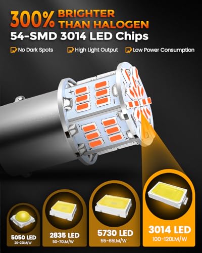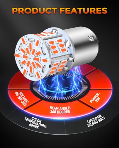 Specification: BANGO 4pcs 1157 led bulb with 54smd 3014 chips, 360° beam angle, voltage 10v-30v (fit 12V, 24V vehicles), power 3W, 400LM per bulb, low power consumption and fast heat dissipation