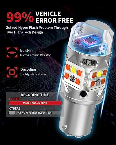 【99% CANBUS ERROR FREE】LASFIT Switchback 1157 LED bulbs are designed to work seamlessly with 99% of vehicle computer systems, thanks to the upgraded built-in resistor. After numerous tests, LASFIT has taken another leap forward by eliminating the need for annoying additional resistor. Your vehicle receives a truly advanced turn signal bulb, and you can say goodbye to worries about hyper flash.