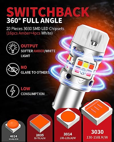 【500% BRIGHTER SWITCHBACK】LASFIT T3 1157 led bulb are 500% brighter than halogen. They are equipped with 20pcs 3030 top-grade LED chips, resulting in a 360° full lighting effect. The bulbs provide 4000LM and 48W of Amber lighting for every turn, Cool White for DRL Parking Light The luminosity of all bulbs has been accurately measured, ensuring a visually appealing driving experience with vibrant colors.