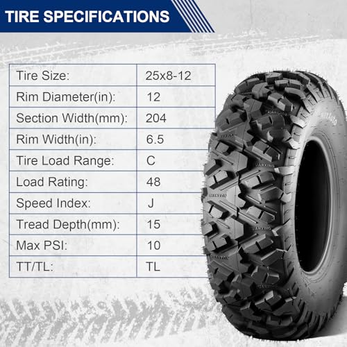 Tire Parameters: Size: 25×8-12, tread depth: 0.59″; rim width: 6.5”; tubeless; max load; 395 lbs; load/speed index: 48J; psi: 10 (Please check the original tire size before purchasing)