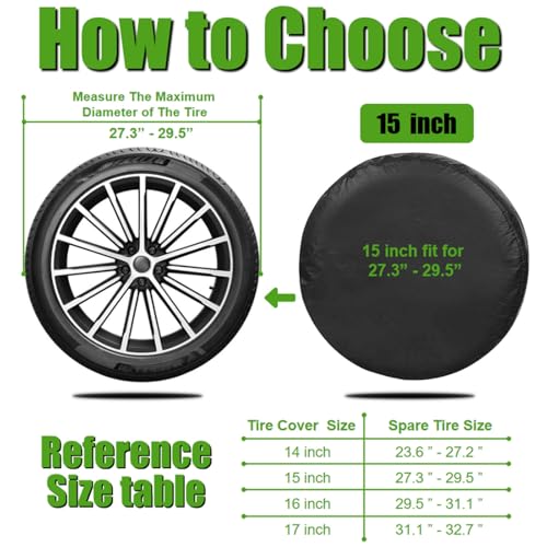 Perfect Fit: This spare tire cover is 15”, fit for diameter 27″ – 29″, please measure your tire before you purcharge. Other tire size please choose our other size spare tire cover
